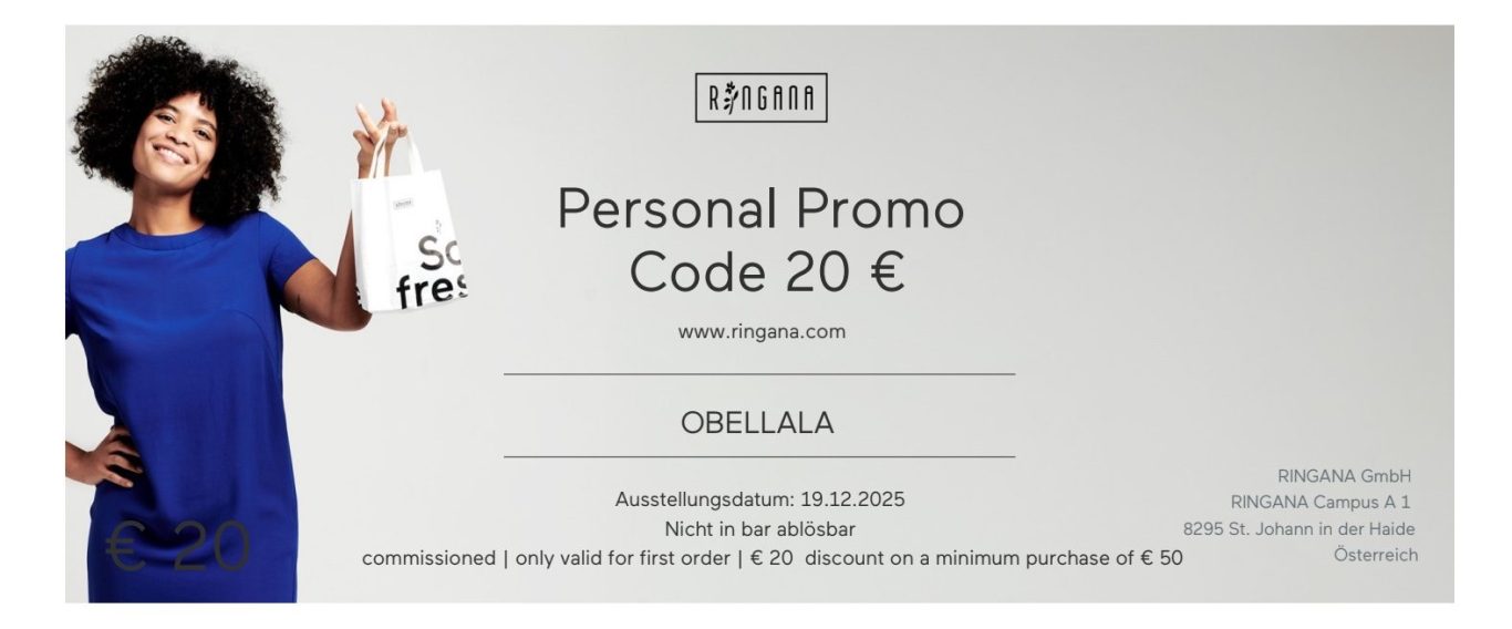 - Gib den 20€ Rabatt Code Obellala beim Bezahlvorgang ein und sichere dir direkt mit dem Gutschein einen Rabatt von 20€ für deine erste Bestellung bei Ringana (Mindestbestellwert 50€)